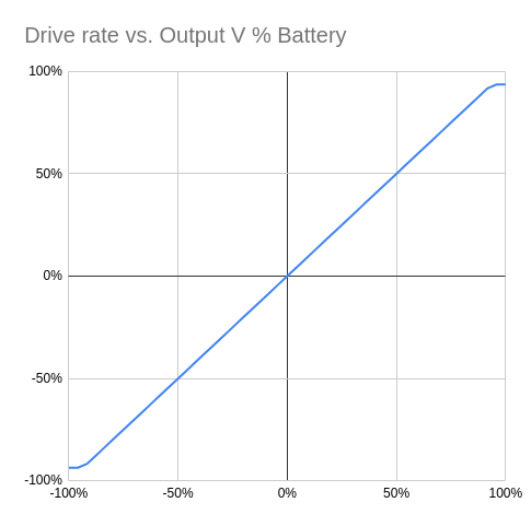 The actual output motor voltage for a given input drive rate is non-linear above approximately a 95% drive rate; the output motor voltage is capped at approximately 95% of the battery voltage (see image below).